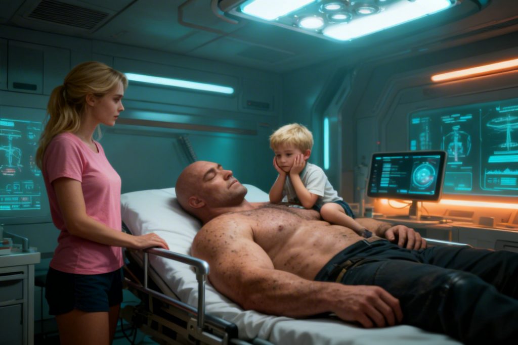 Pi being revived after near death. Tannis and Del wait patiently for him to wake up.